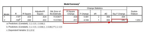8.可以看r方的该变量,第二个方程,sig F change值小于0.05,证明调节效应存在。