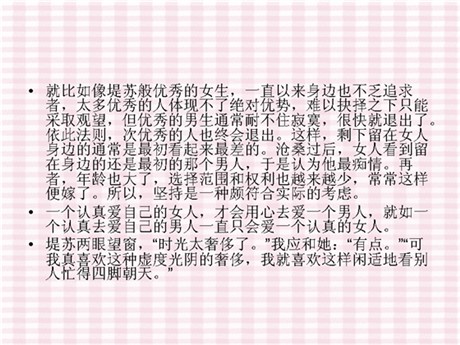 就比如像堤苏般优秀的女生,一直以来身边也不乏追求者,太多优秀的人体现不了绝对优势,难以抉择之下只能采取观望,但优秀的男生通常耐不住寂寞,很快就退出了。依此法则,次优秀的人也终会退出。这样,剩下留在女人身边的通常是最初看起来最差的。沧桑过后,女人看到留在身边的还是最初的那个男人,于是认为他最痴情。再者,年龄也大了,选择范围和权利也越来越少,常常这样便嫁了。所以,坚持是一种颇符合实际的考虑。