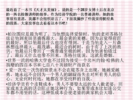 《天才爱美丽》这本书 是我昨天看完的 主人公 宋提苏 是个28岁的女博士后,同时有是个我行我素,单身的,美貌的优秀女性,作为一所名校的 讲师,不免遭到别人的白眼,她把学校的一些事情用经济学的,爱情哲学阐述出来。