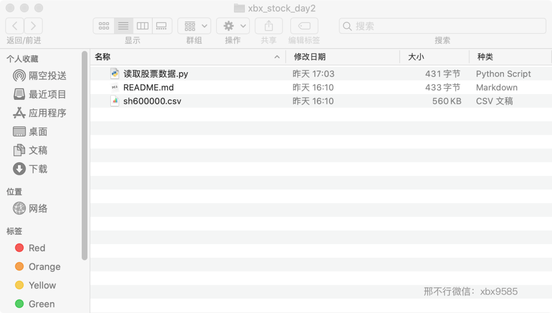这是我电脑本地的一个Python项目文件,里面包含了我们需要的代码(读取股票数据.py)以及数据(sh600000.csv)。