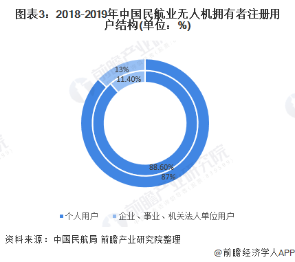 从无人机拥有者注册用户结构上看,主要以个人用户为主,但占比呈下降趋势。截至2019年底,中国民航业无人机拥有者中个人用户占总体的87%,比2018年下降1.6个百分点;企业、事业、机关法人单位用户占总体的13%,比2018年上升1.6个百分点。综合来看,我国民用无人机在企业、事业、机关法人单位的应用方面,市场潜力还有待挖掘。