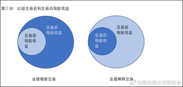 如下图所示,增厚稀释分析过程最需要关注的步骤就是步骤2。步骤1仅仅是将两个公司的收益简单相加;步骤3仅仅是比较哪个数字更大(交易之前和交易之后的每股收益)。