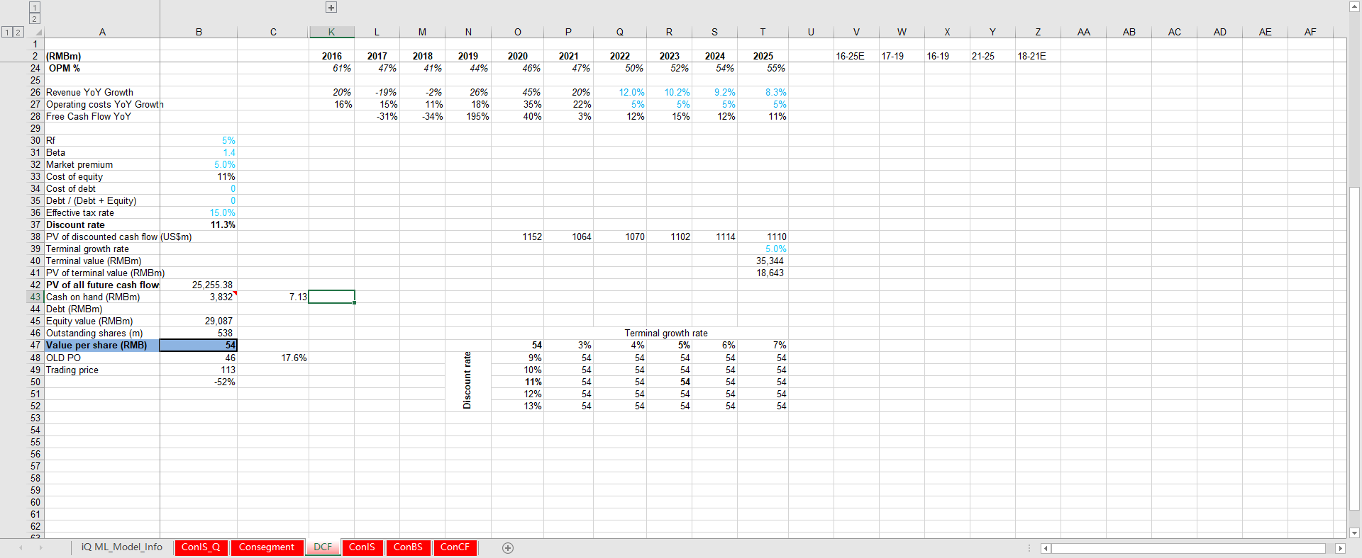 模型内容包括Balance Sheet,Cash Flow Statement,Income Statement,Sensitivity Analysis,Growth Assumptions,DCF Valuations等几个模块。