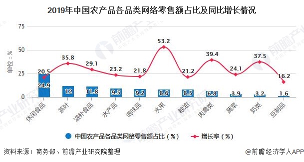 根据商务大数据监测,全国农产品网络零售额达3975亿元,同比增长27.0%。休闲食品、茶叶和滋补食品销售额排名前三,占比分别为24.9%、12.0%和11.8%;水果、肉禽蛋、奶类和茶叶四品类同比增速超过30.0%。