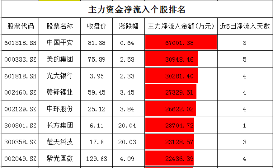 个股资金净流入方面,中国平安净流入超过6.8亿元,美的集团、光大银行净流入超过3亿元,赣锋锂业、中环股份净流入在2.6-2.8亿元。