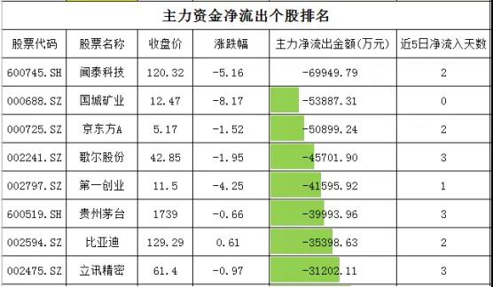 个股资金净流出方面,闻泰科技净流出近7亿元,国城矿业、京东方A净流出在5-5.4亿元,歌尔股份、第一创业净流出在4.1-4.6亿元。