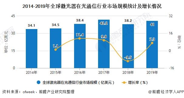 从激光器在通信行业的应用市场规模来看,2019年市场规模为41亿美元,同比增长7.3%,总体规模实现了一定的增长。但在通信应用市场,2017年和2018年,大多数4G蜂窝网络部署已经完成,2019年5G仍处于建设元年,市场需求相对较小,导致来自通信市场的激光器收入下降。