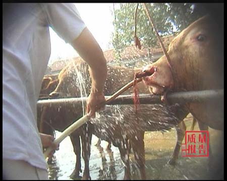 离开茌平县,记者随后对东昌府区、高唐县、阳谷县等地的十几家屠宰场进行调查采访后发现。给活牛灌水的现象十分普遍。在高唐县鲁西肉类营销大市场记者看到,活牛在宰杀前都要灌水,宰杀后还要通过动脉血管再注水。这头牛被注进了一桶水,但屠户连留在管子里的水也不肯放弃,高高地举着水管,努力里将残留在水管里的水注进牛的体内。