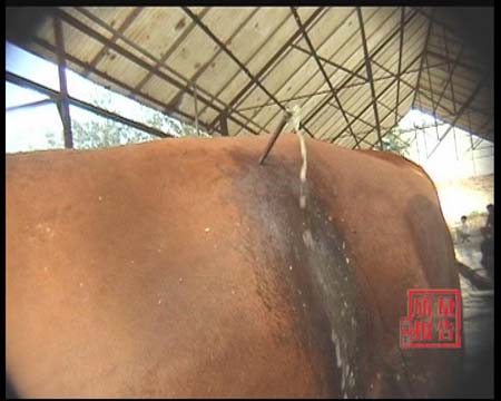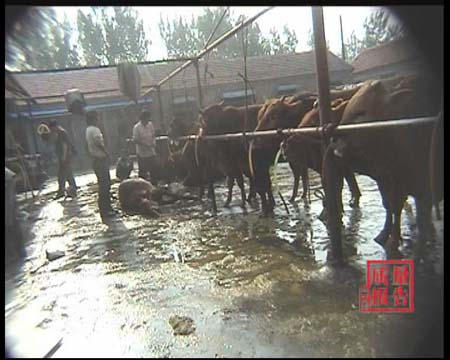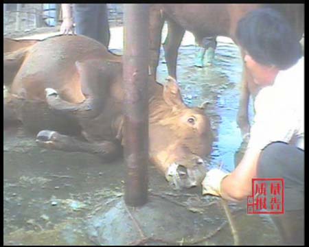 几个小时后,这些接受“洗胃”的活牛,肚子被灌得滚圆滚圆的,四脚朝天,直翻白眼,发出痛苦的哀鸣。(空镜)面对已经是奄奄一息的活牛,屠户们仍不肯罢手。他们接着将一根十多厘米长,小拇指粗的锋利的钢管插入牛的胃里。