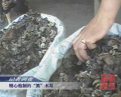 记者在调查中发现,不法商贩制售木耳的厂房条件简陋,卫生状况也极其恶劣。不法商贩为了使他们用低价收来的木耳更像东北优质木耳可谓“煞费苦心”,他们不但用剪刀将这些大木耳修剪成东北木耳的形状。而且用劣质墨汁着色,使其看起来乌黑发亮。另外,为了增加木耳的重量,不法商贩还在木耳中加入了一种叫料子的东西。